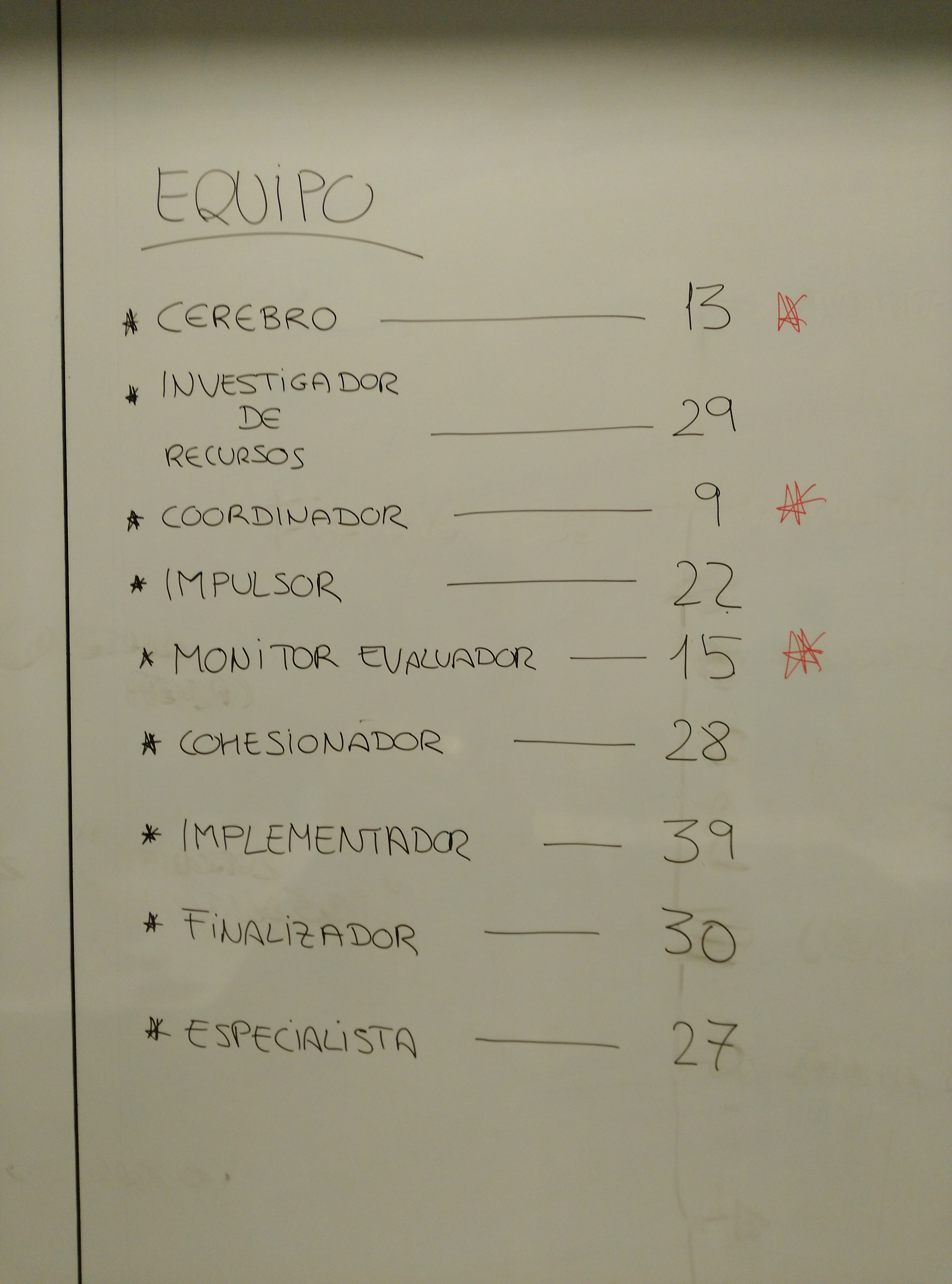 Con el recuento pudimos detectar si había carencias de algún rol en concreto. No importa quién tenga un comportamiento u otro, importa qué rol queda poco o nada reflejado en el equipo. Además, estos roles se pueden agrupar en tres grupos distintos: Acción – Sociales – Mentales. Así también se puede identificar si las carencias quedan compensadas o hay que reaccionar a un nivel más generalizado. En nuestro caso el área «Mentales» era la que quedaba más afectada. Somos un equipo de sólo técnicos (no preguntéis por qué, la vida a veces es dura 🙂 ), y como podéis observar, quedó muy bien reflejado que el área de «Acción» estaba cubierta con creces.